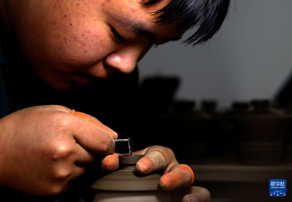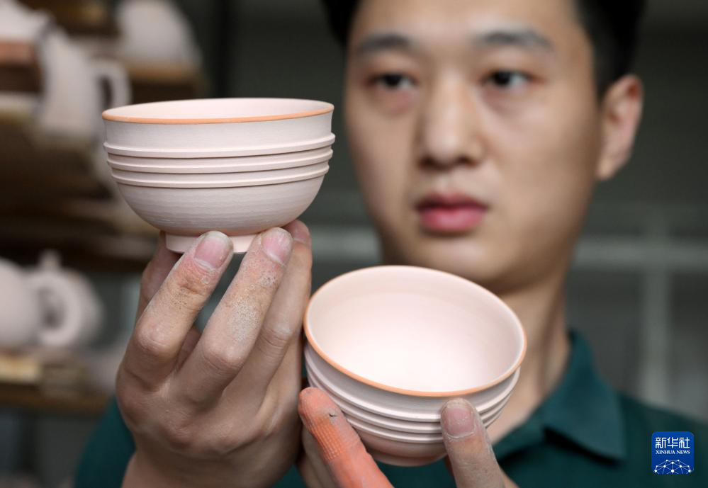 工作人员在河南省禹州市驺虞窑的工作室里检查钧瓷素坯质量(7月2日摄)。