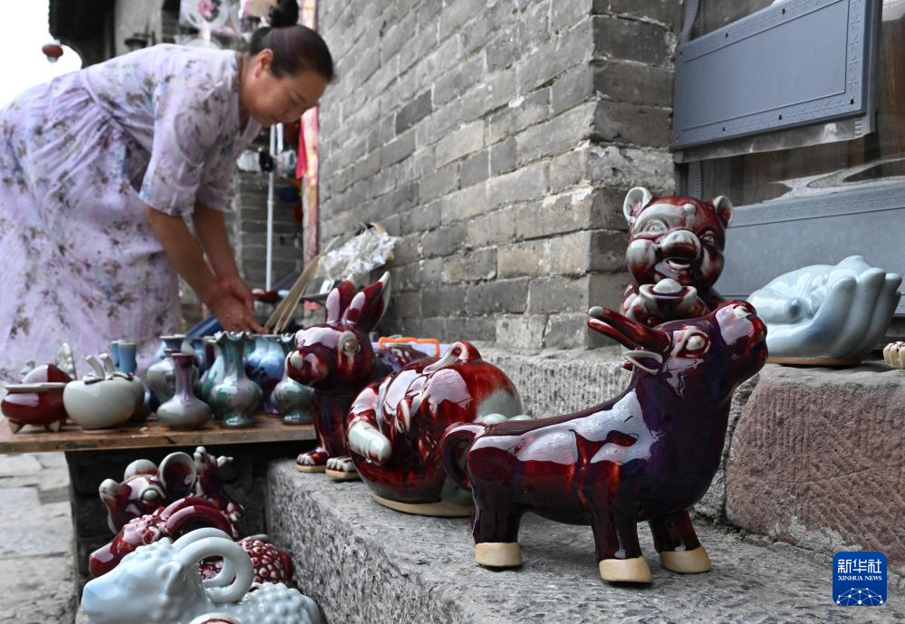 在河南省禹州市神垕镇,一家钧瓷店铺的工作人员在店外整理货品(7月3日摄)。