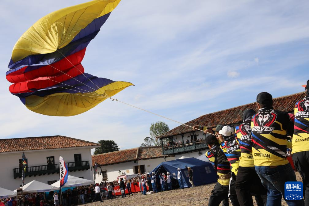 8月17日,在哥伦比亚莱瓦,人们放飞哥伦比亚国旗颜色的巨型风筝。