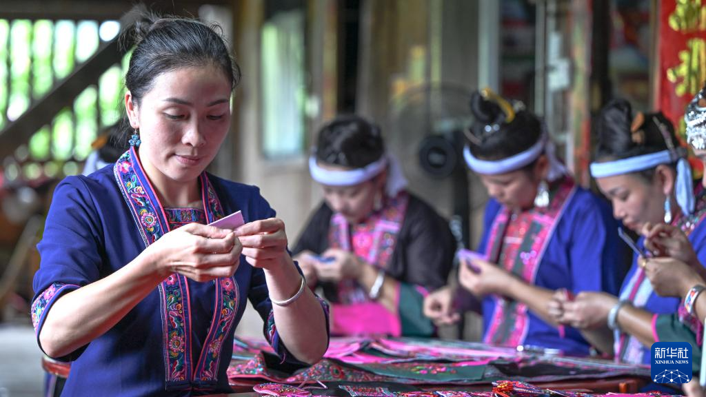在广西三江侗族自治县,侗族刺绣是一种集纺织、印染、剪纸、刺绣于一体的传统手工艺,其绣品图案精美、色彩艳丽,成为助力侗乡民众增收的特色产业。