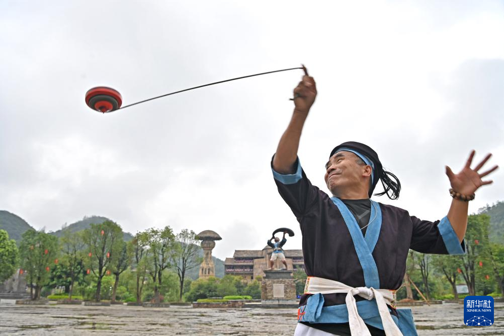 何光斌在南丹县里湖瑶族乡朵努社区展示空中放陀螺(8月30日摄)。