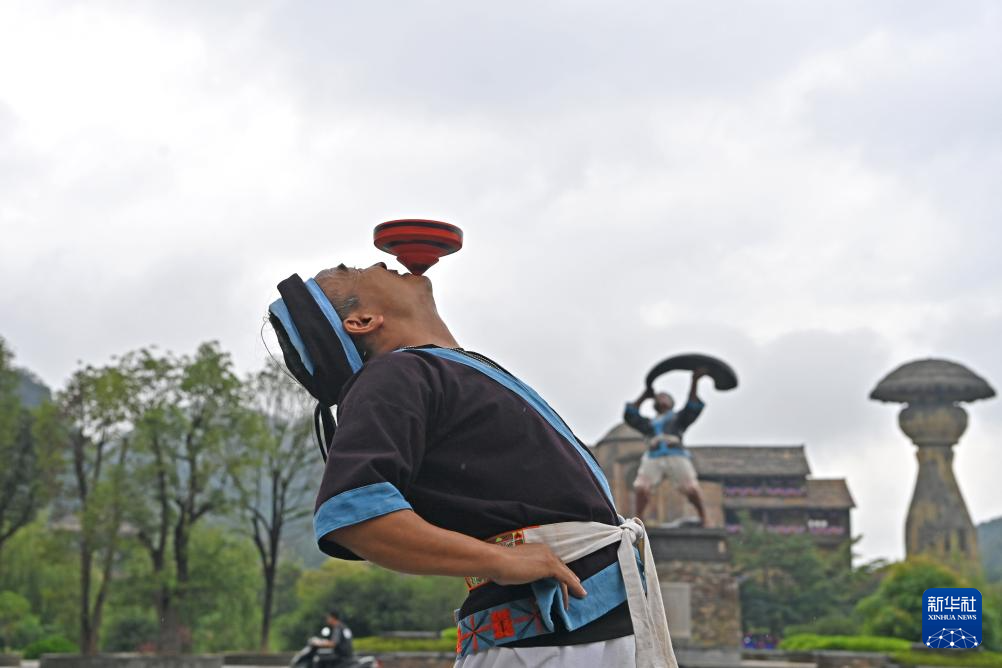何光斌在南丹县里湖瑶族乡朵努社区展示下巴上放陀螺(8月30日摄)。
