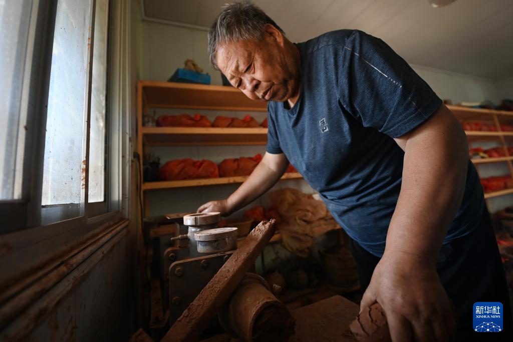 9月3日,阎建林在家中使用机器和泥。