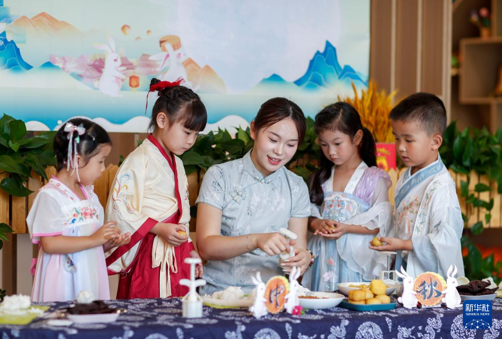 9月8日,在河北省石家庄市北郡小学,小朋友在老师的指导下制作月饼。