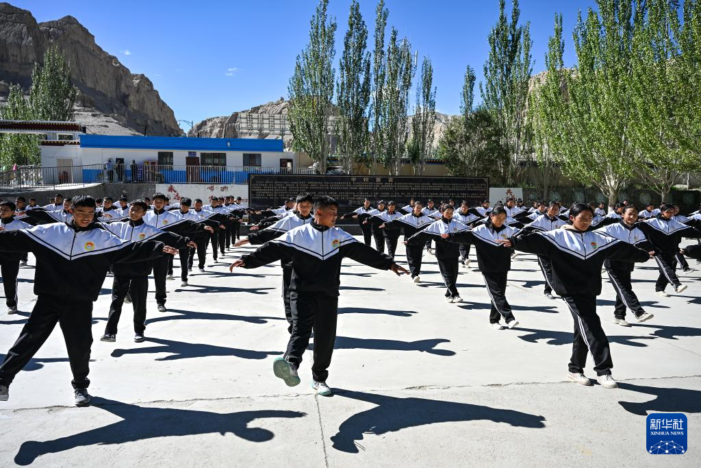 在西藏阿里地区札达县九年一贯制学校,学生们跳起融入“宣舞”特色的课间操(9月10日摄)。
