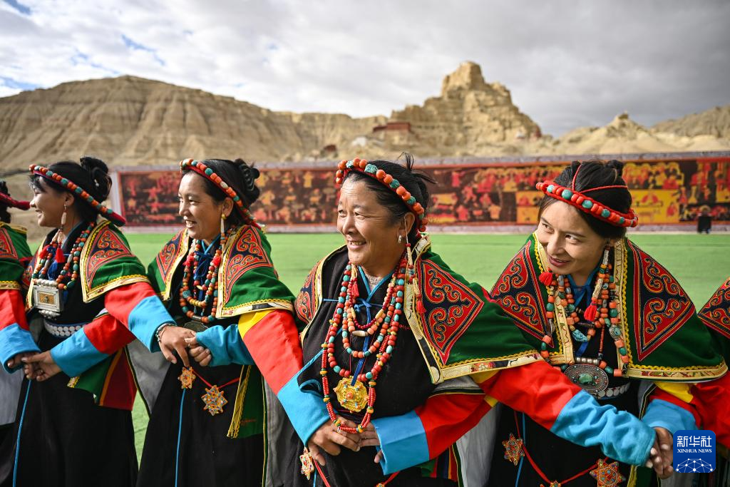 在西藏阿里地区札达县古格王国遗址脚下,当地村民表演“宣舞”(9月11日摄)。