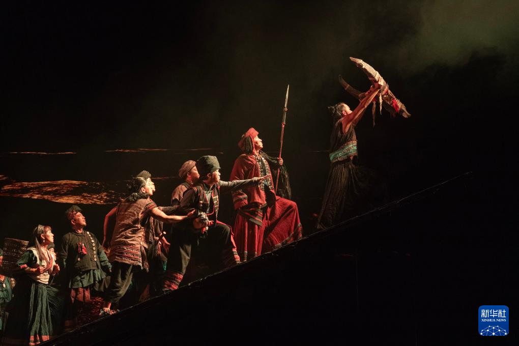 10月13日晚,演员在云南省大剧院表演话剧《澜沧水长》。