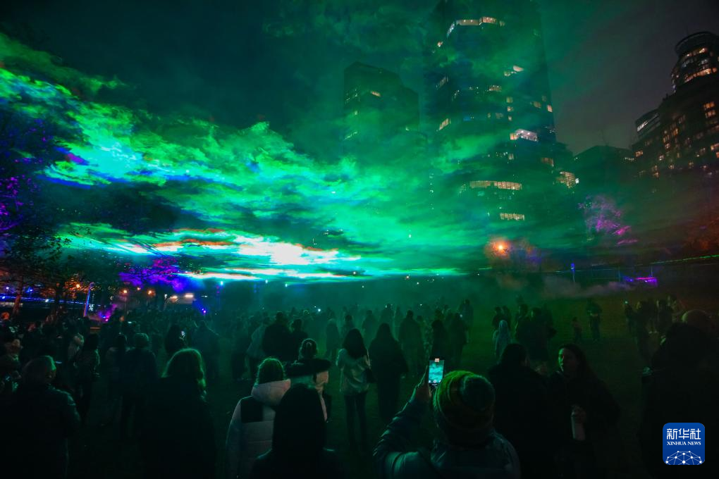 11月9日,在加拿大温哥华举办的灯光节上,人们观赏一个模拟极光的灯光装置。