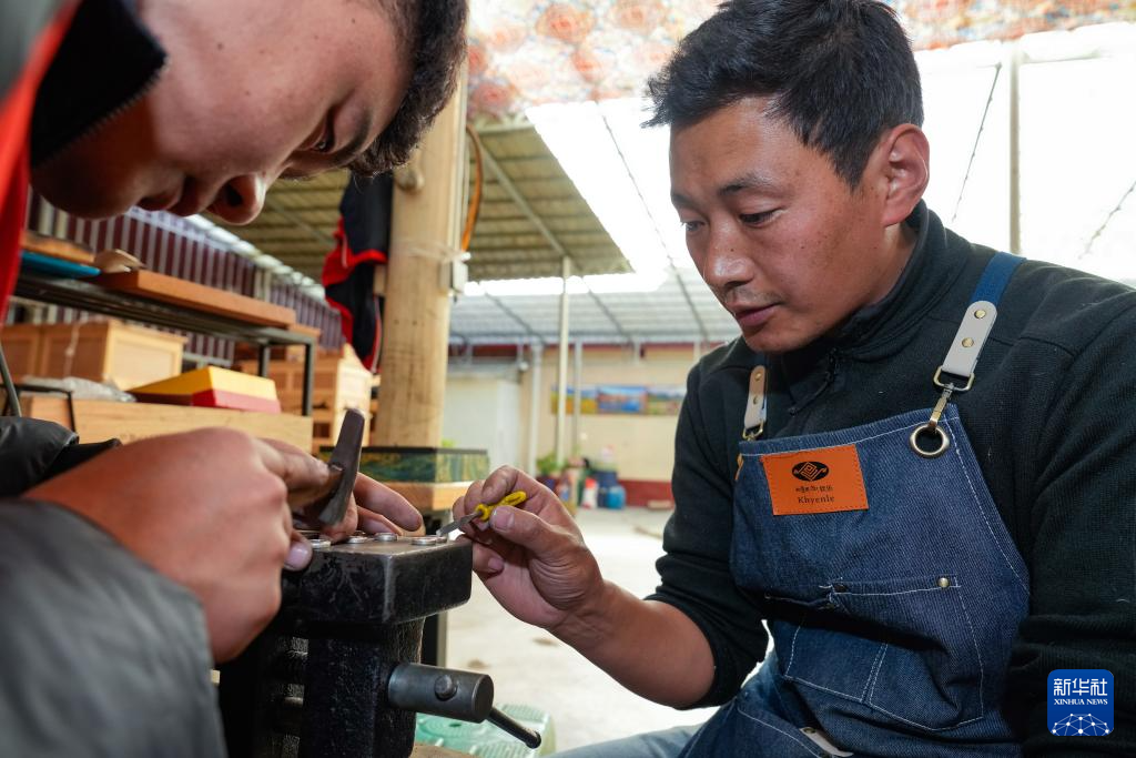 在2024年德格县“善地文创手艺人”特色劳务品牌培训班上,达瓦扎巴(右)指导一名当地学徒用传统银包铜工艺制作文创产品(11月3日摄)。达瓦扎巴1992年出生在四川省甘孜藏族自治州德格县麦宿镇一个手工艺家庭,其家族有约两百年制作利玛铜铸制品的历史。达瓦扎巴从小跟随父亲尼玛学习。如今,他已是非遗项目“藏族金属锻造技艺”四川省甘孜州代表性传承人。达瓦扎巴在继承传统工艺的同时,开发创作时尚文创产品,将藏族传统手工艺推向国际市场。目前,其家族的“钦乐工坊”有全职手艺人约40名。
