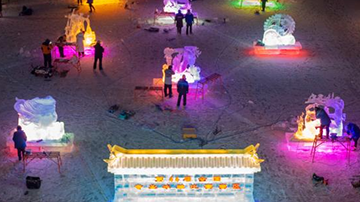 1月7日,在哈尔滨市兆麟公园,冰雕师在雕琢冰雕作品的部件。