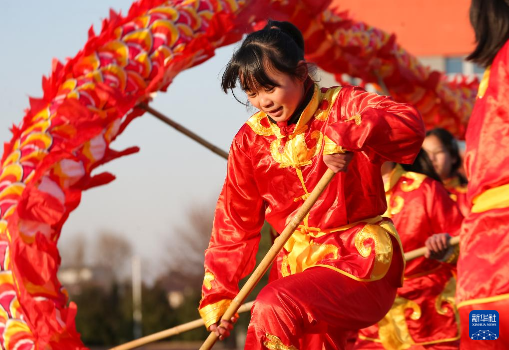 1月10日,非遗传承人在江苏省镇江句容市葛村中心小学教授学生练习舞龙技艺,带领孩子们感受传统文化魅力,迎接新春佳节。