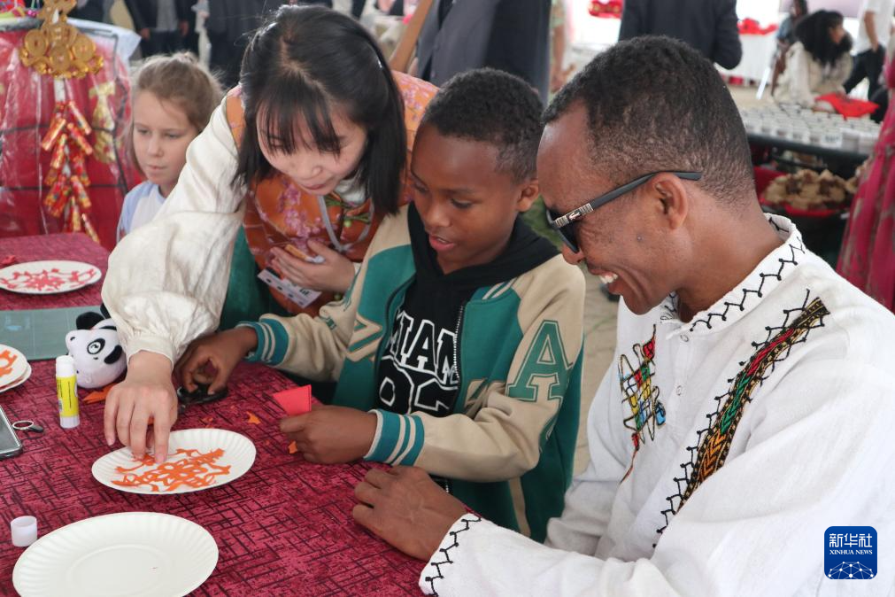 1月12日,在埃塞俄比亚首都亚的斯亚贝巴友谊广场,当地市民在“庆祝中埃塞建交55周年暨欢乐春节活动”现场体验中国剪纸文化。