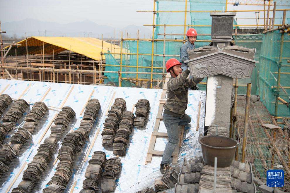 1月6日,工人在黄山徽匠园林古建有限公司厂区搭建徽派仿古建筑。