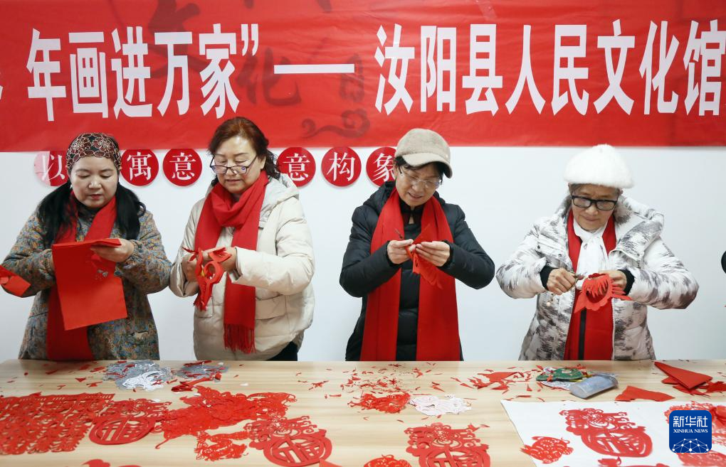 1月23日,河南省洛阳市汝阳县人民文化馆组织县龙乡剪纸协会的剪纸艺人到城关镇杜康社区开展为居民剪年画送祝福活动。
