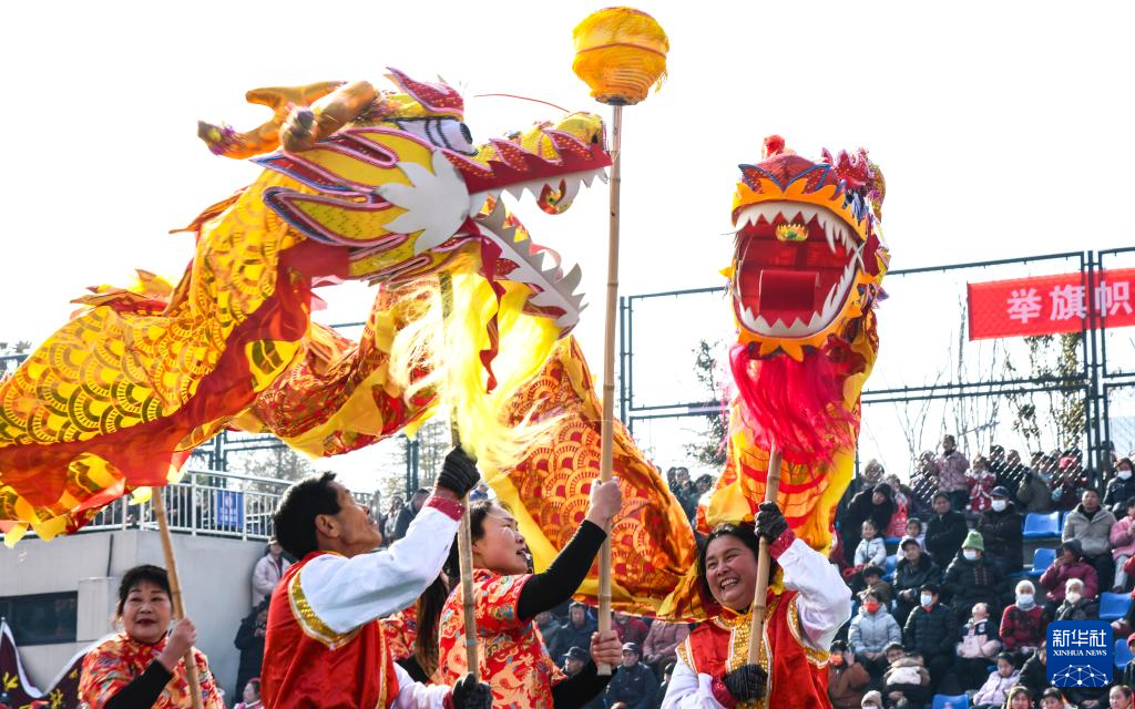 2月10日,民间艺人在河南省济源市承留镇智慧体育公园篮球场表演舞龙。
