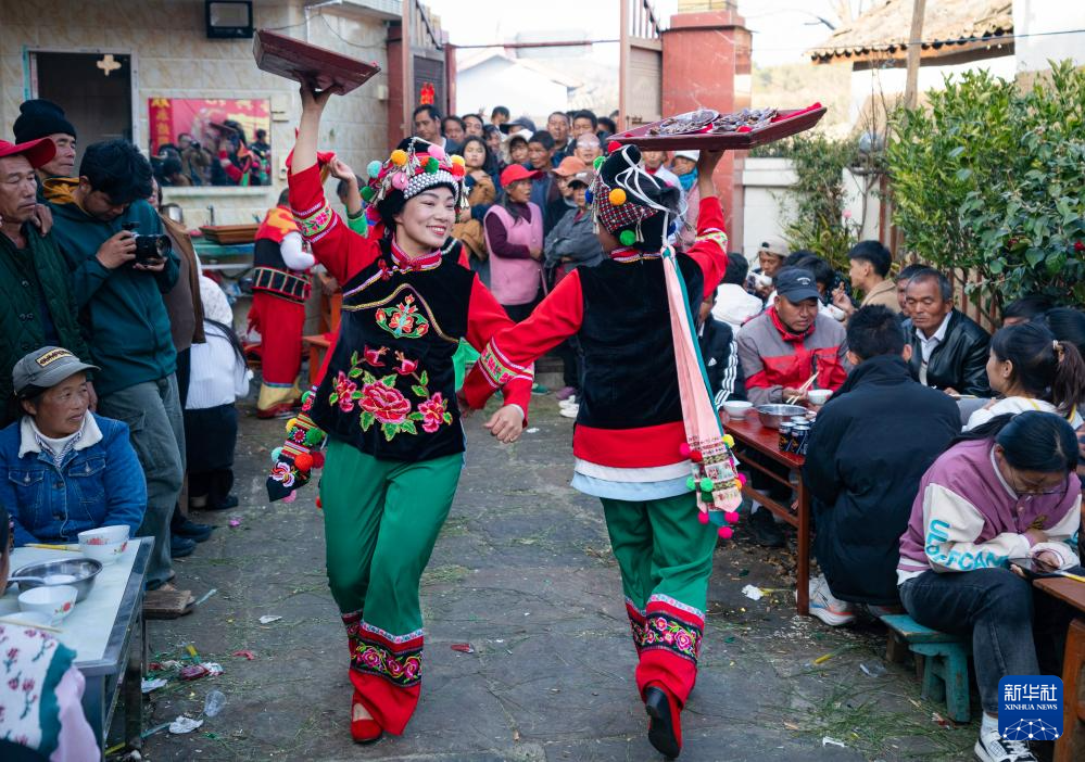 鲁丽华(中)在南涧彝族自治县宝华镇拥政村一农户家的婚礼上表演跳菜(2025年2月7日摄)。