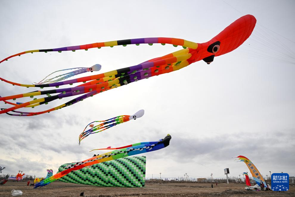 这是3月8日在新疆都拉塔口岸房车露营基地拍摄的风筝表演。