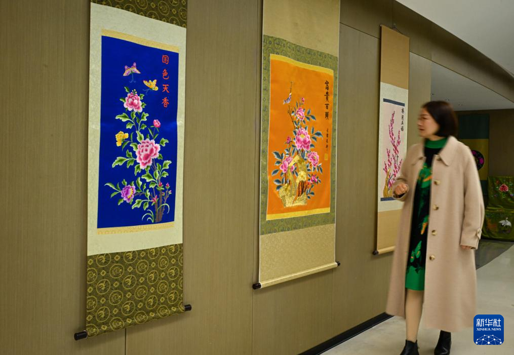 这是3月14日在任炜汉绣工作室拍摄的汉绣制品。