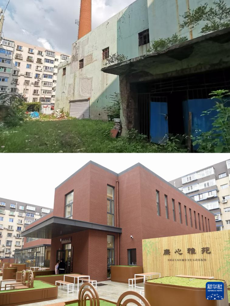 拼板照片:上图为改造前的废弃锅炉房(资料照片,新华社发);下图为3月25日拍摄的“廉心雅苑”(新华社记者 吴青昊 摄)。