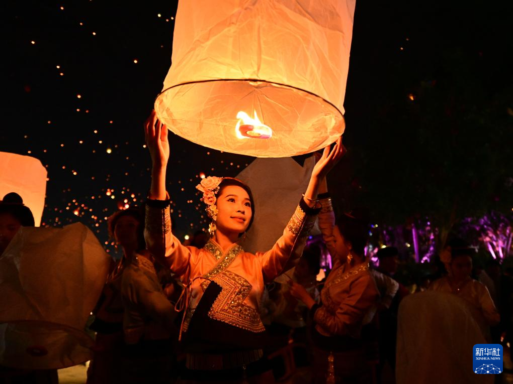 4月13日晚,人们在西双版纳傣族自治州景洪市澜沧江畔放飞孔明灯。
