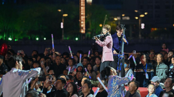 4月19日晚,天津交响乐团常任指挥易娟子在桥边音乐汇演出活动上指挥。