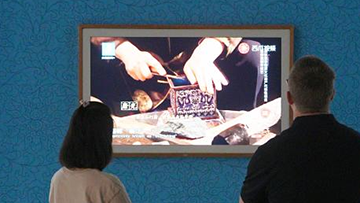 4月28日,观众在青岛电影博物馆农村露天放映场景复原展区参观。