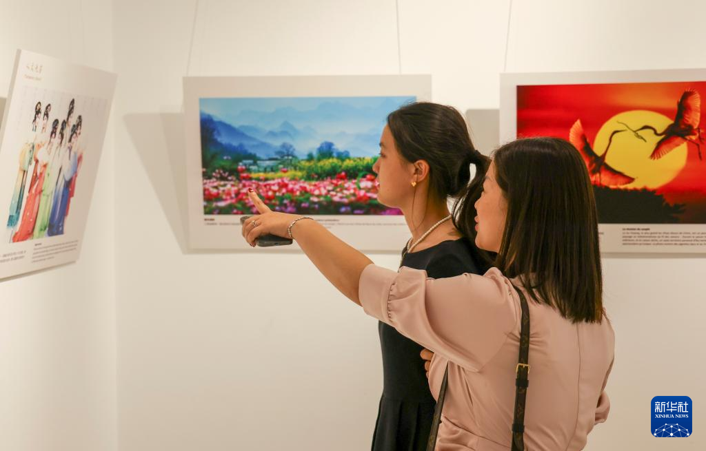 5月9日,在摩洛哥首都拉巴特举行的“茶和天下·雅集”暨“江西风景独好”摩洛哥“江西日”活动现场,来宾参观“如画江西 风景独好”图片展。