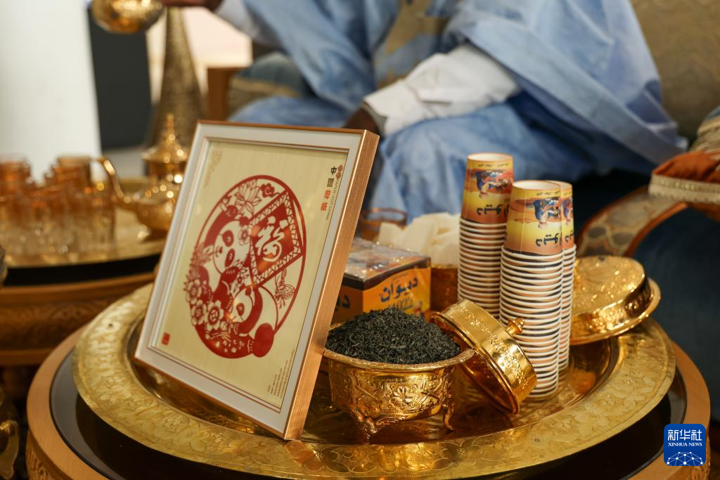 5月9日,在摩洛哥首都拉巴特举行的“茶和天下·雅集”暨“江西风景独好”摩洛哥“江西日”活动现场,一件中国剪纸作品被摆放在摩洛哥茶艺表演现场。