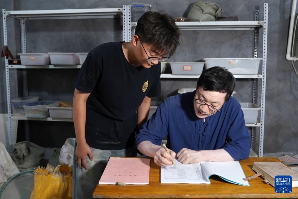 6月28日,张志忠(右)和学生研究记录烧制白瓷的原料配方。