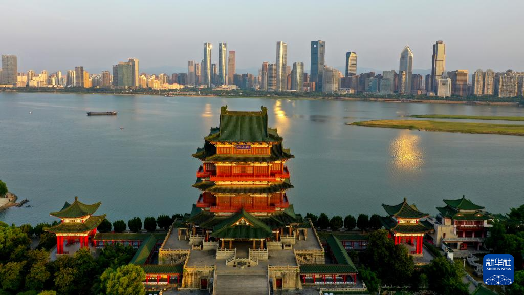 晨光中的江西南昌滕王阁景区(7月7日摄,无人机照片)。