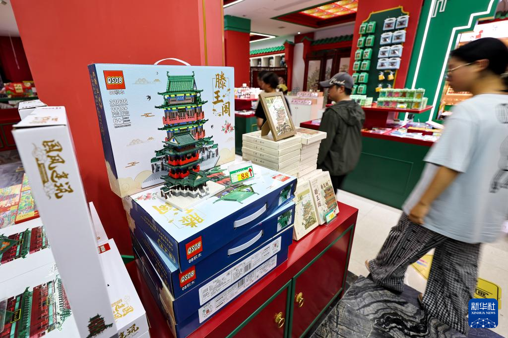 这是7月7日在江西南昌滕王阁景区内拍摄的滕王阁文创产品。