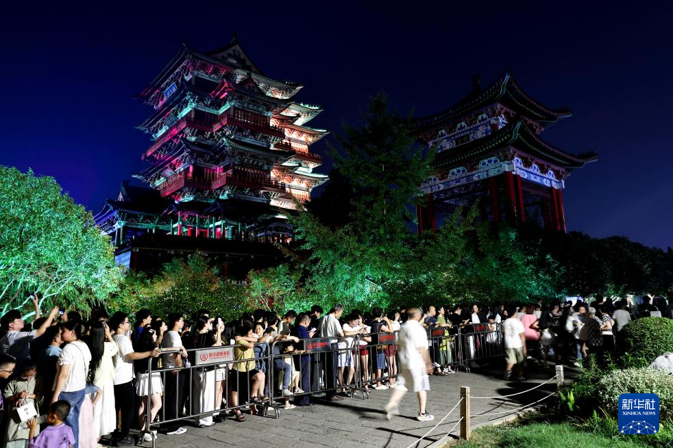 7月7日,夜间游览的游客在江西南昌滕王阁景区内排队等待登阁。