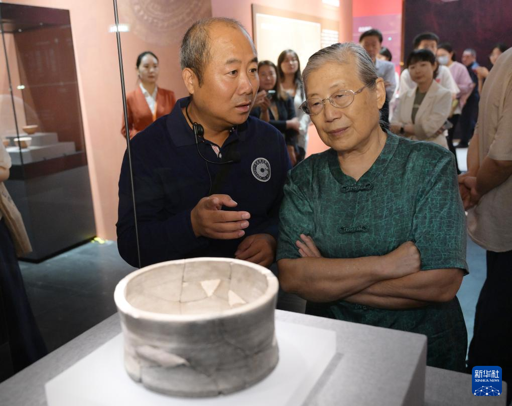 7月28日,著名考古学家、中国社会科学院考古研究所研究员安家瑶(右)在雄安新区联合考古队领队何岁利的陪同下参观展览。