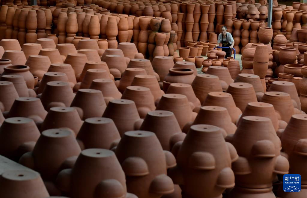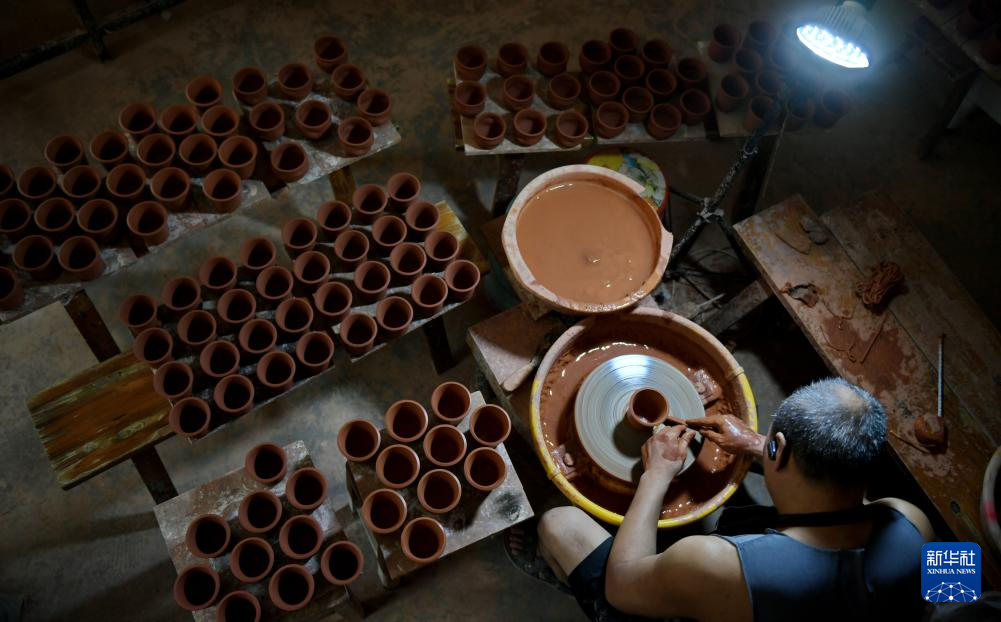 8月11日,在四川省彭州市桂花镇桂花龙窑,陶艺制作人员在赶制陶器。