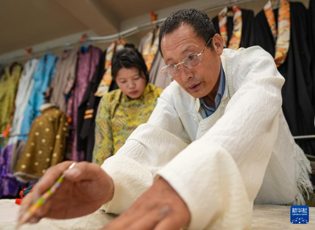 在拉萨雪堆白传统手工艺术学校,60岁的西藏自治区级非物质文化遗产项目藏族服饰(拉萨服饰)代表性传承人洛桑麦朗,与学徒一道研究、制作藏装。从艺四十余载,他培养了百余名弟子,还参与编撰教材、建立藏族服饰数据库等工作。在他的巧手下,新式藏装将传统与现代交融,让非遗技艺与现代审美碰撞,成为街头一道靓丽的风景。