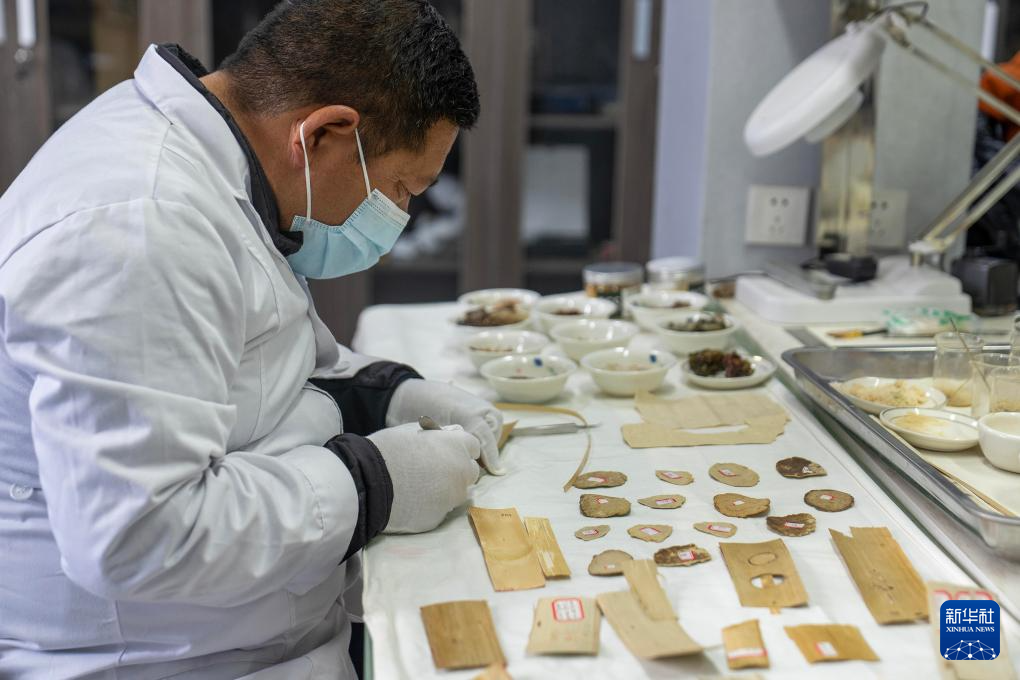 布达拉宫贝叶经实验性修复小组实验室工作人员对贝叶进行处理(2025年5月25日摄)。新华社记者 旦增尼玛曲珠 摄