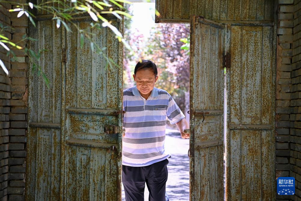 杜德建推开位于山西省永济市卿头镇张坊村的张坊学校大门(9月9日摄)。由于家中图书越来越多,2015年,杜德建租下村里学校闲置的几间房屋用于存放图书、报刊。