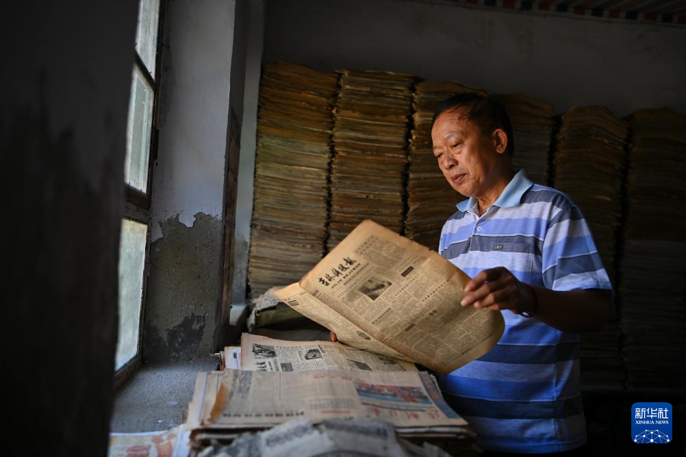 杜德建在位于山西省永济市卿头镇张坊村张坊学校内的图书室内查看一份旧报纸(9月9日摄)。由于家中图书越来越多,2015年,杜德建租下村里学校闲置的几间房屋用于存放图书、报刊。