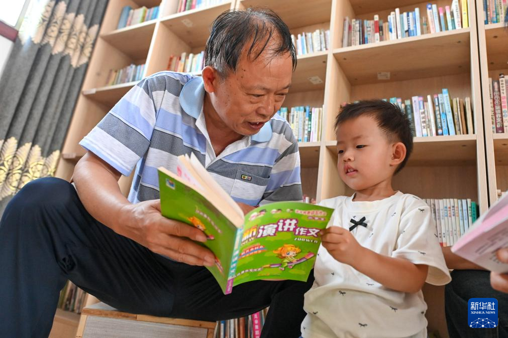 在位于山西省永济市卿头镇张坊村的家庭图书馆内,杜德建(左)和一位小朋友交流(9月9日摄)。