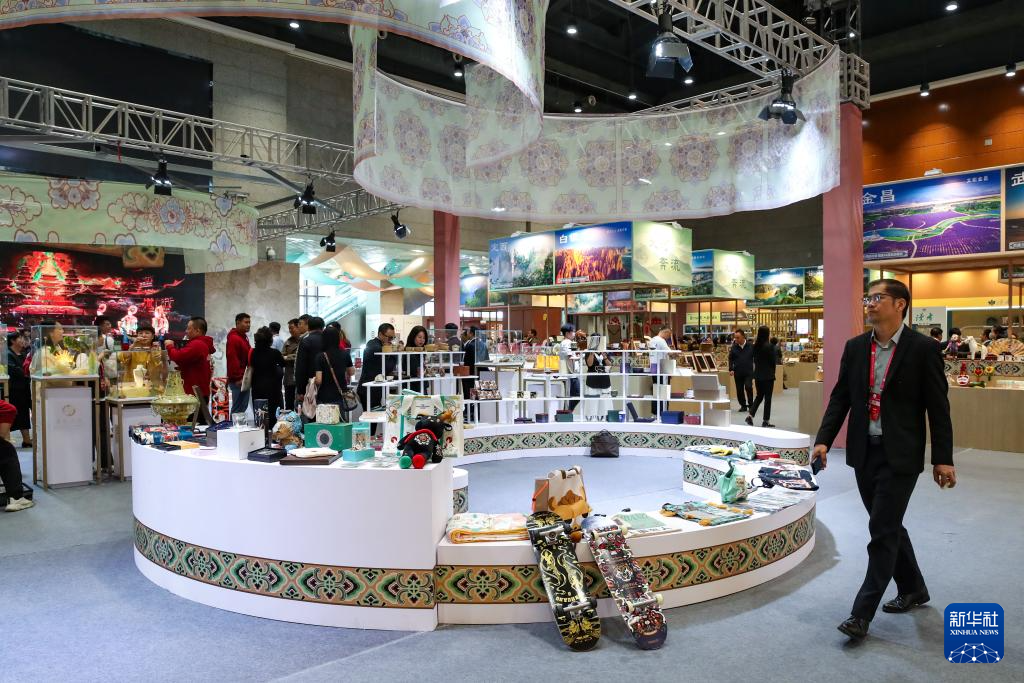 9月21日,与会嘉宾在第八届丝绸之路(敦煌)国际文化博览会上参观甘肃文旅非遗文创展。