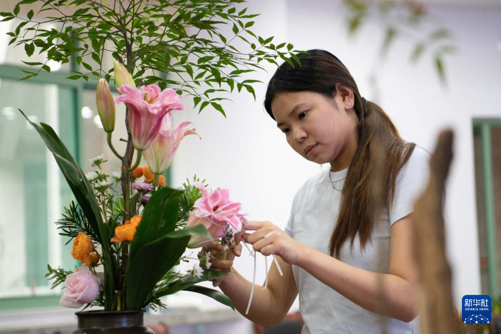 9月29日,在安徽农业大学林学与园林学院徽派插花艺术传承基地,徽派插花艺术传承团队成员进行插花艺术创作。