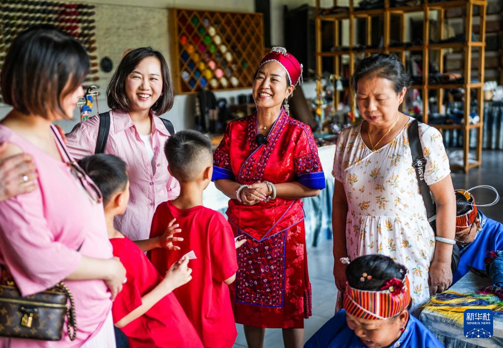 龙禄颖在位于贵州省施秉县的舞水云台非遗工坊和游客交流(10月10日摄)。