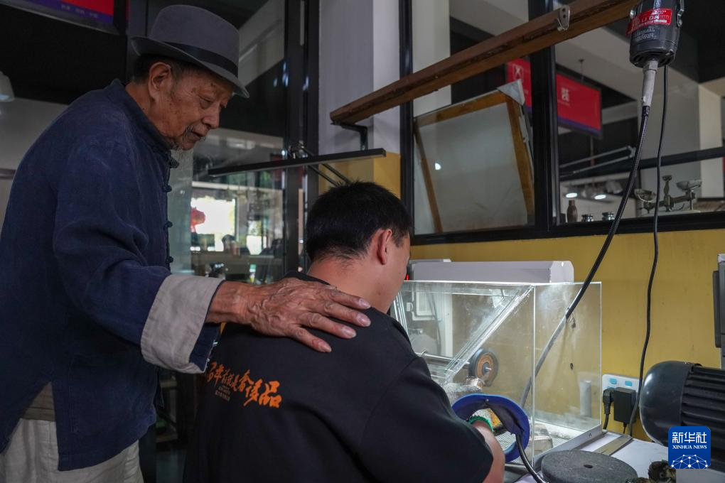 10月25日,在昆明乌铜走银传习馆,金永才(右)与弟子交流。