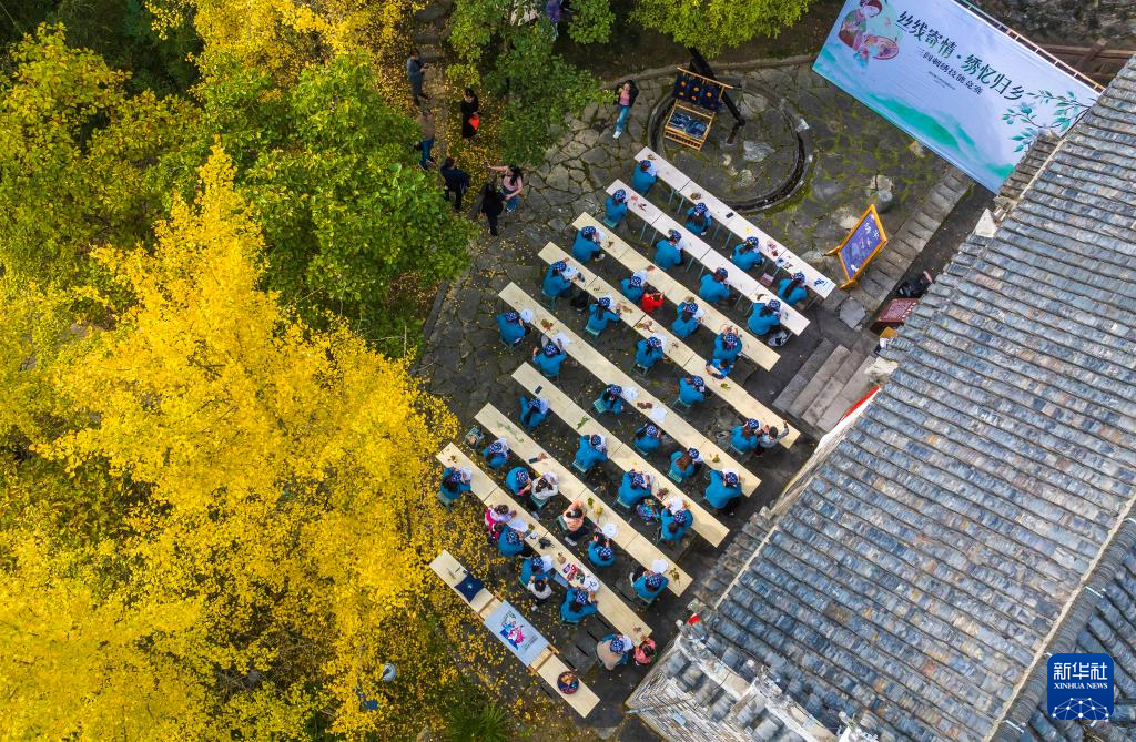 11月2日,绣娘代表在湖北省宜昌市秭归县屈原故里景区芈绣馆参加刺绣技艺比赛(无人机照片)。