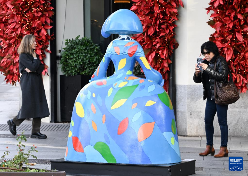 11月19日,行人在西班牙马德里街头欣赏“宫娥”主题雕塑。