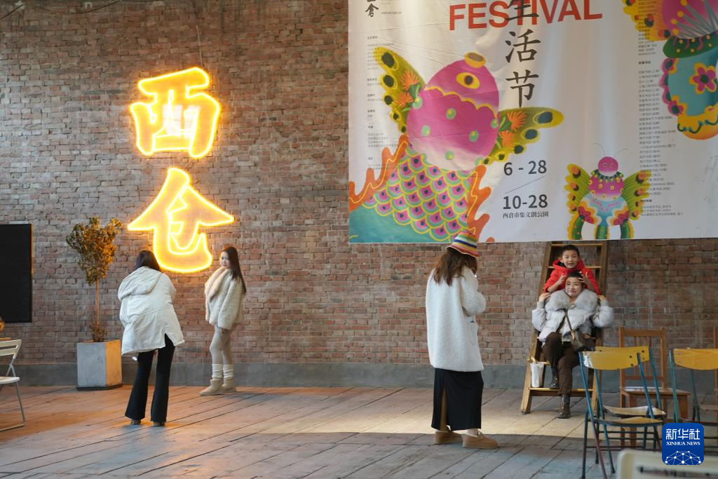 12月6日,游人在西安西仓市集文创公园一处文化空间内拍照。这座公园由位于西安市莲湖区的老西仓市集改造而来。