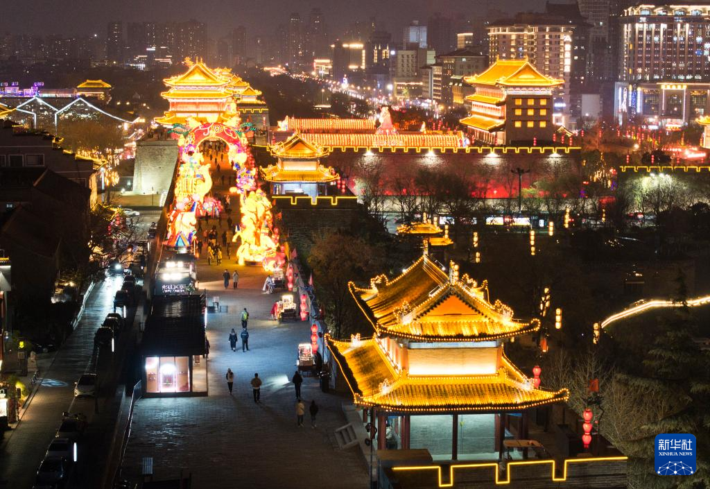 1月4日拍摄的西安城墙南门“长安灯会”景色(无人机照片)。