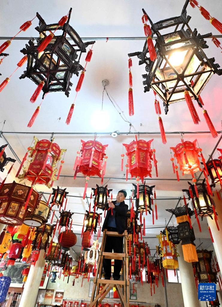 1月15日,工人在石家庄市藁城区屯头村一家宫灯厂展厅悬挂宫灯。