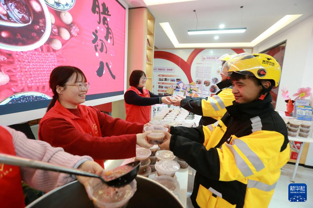 1月26日,在江苏省扬州市徐凝门街社区,志愿者为外卖员送上腊八粥。