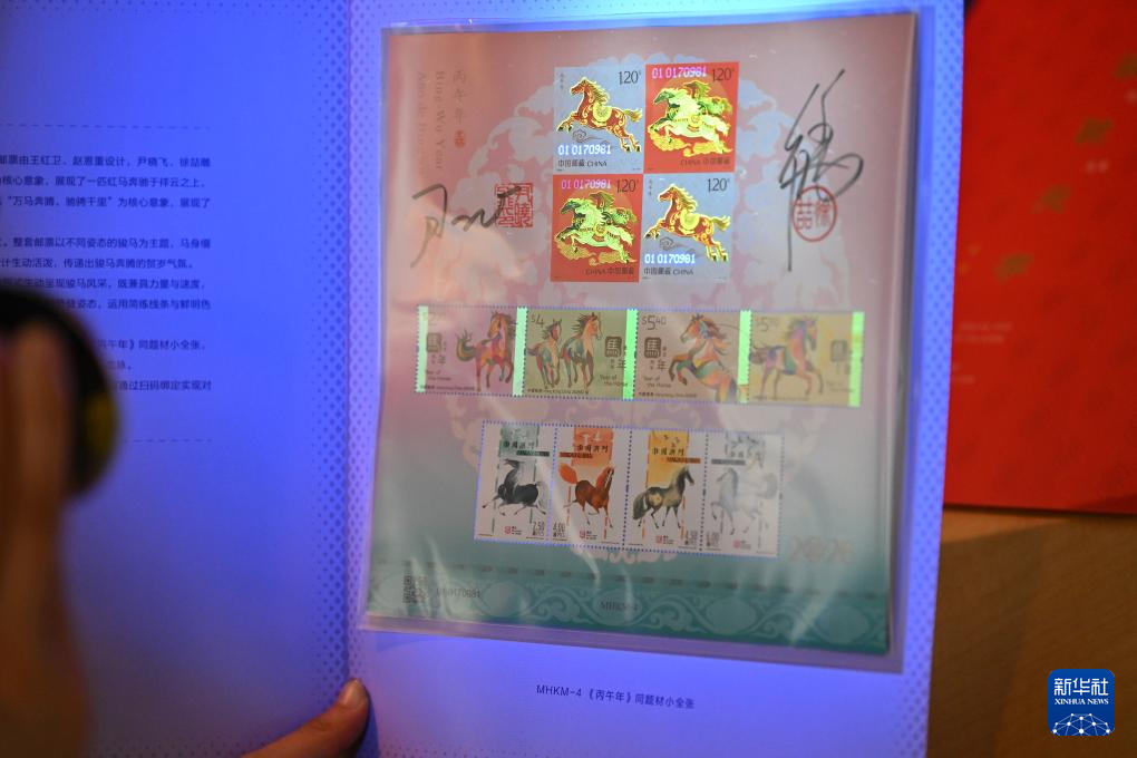 1月29日,工作人员展示活动现场发布的《跃马乾坤 八方来财》雕刻版生肖主题邮票珍藏摆件(左)和《骏驰元宇》邮票珍藏册。